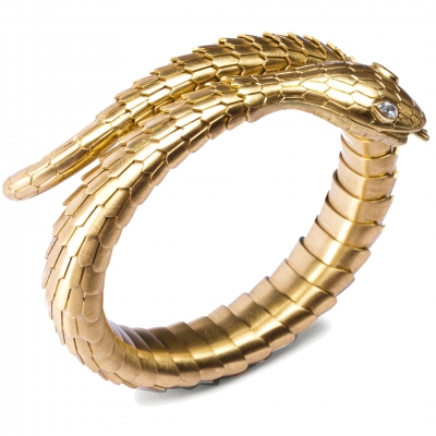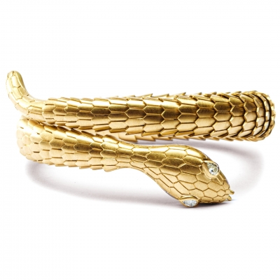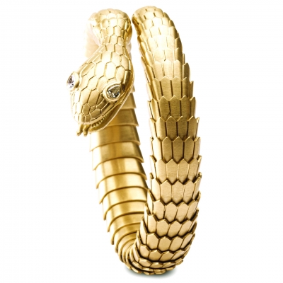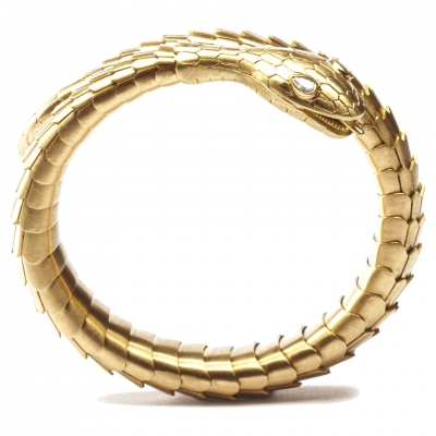 This magnificent flexible coil bracelet is designed as a snake, with drop brilliant-cut diamonds as eyes, and entirely hand crafted in 18 karat brushed yellow gold with a total weight of 92.8 grams. The drop cut diamonds weight 0.19 carats and are set on the head of the serpent. The body is made of individually hinged scale links. A superior quality, exceptionally modern piece of jewellery, with an eye on tradition and meaning .