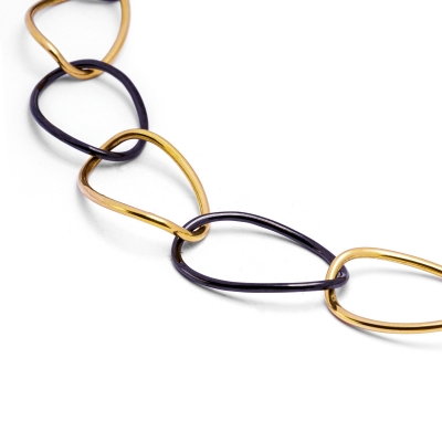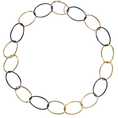 This 48 cm long necklace in 18 karat yellow gold, consists of 11 gold oval curb links alternating with 7 black high-tech ceramic curb links. With a hardness approaching that of diamond, high-tech ceramic is a highly scratch-resistant material. Light and biocompatible, it is extremely skin friendly and pleasant to wear.