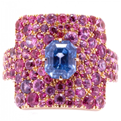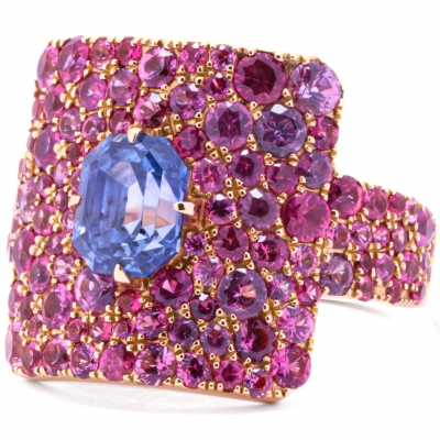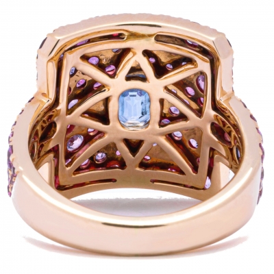 Questo anello in oro rosa 18 carati, con sagoma quadrata, porta al centro uno zaffiro Ceylon non scaldato di 1.65 carati. Attorniato da un pavé di zaffiri rosa per un totale di carati 3.34.