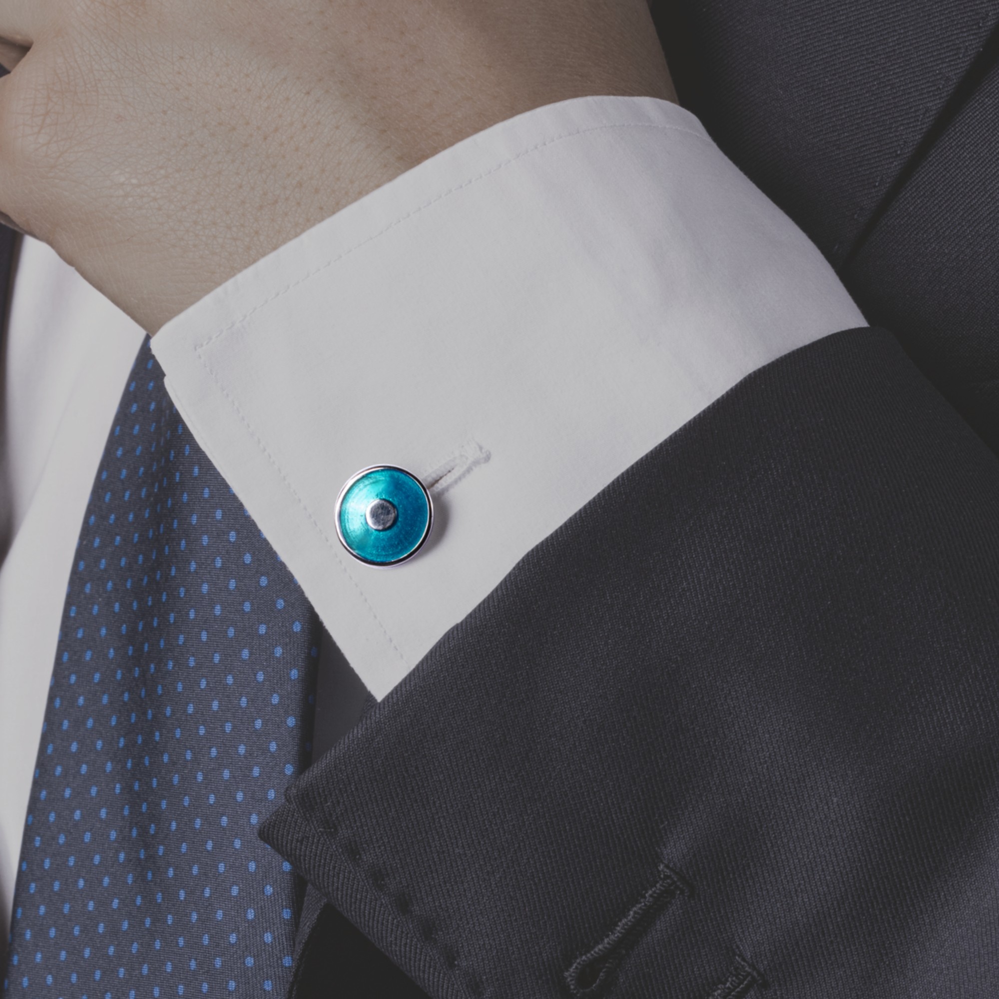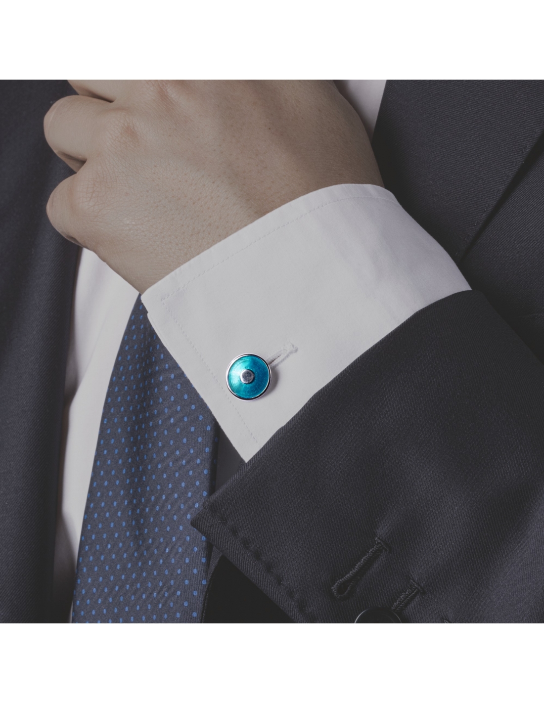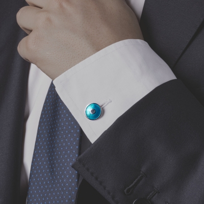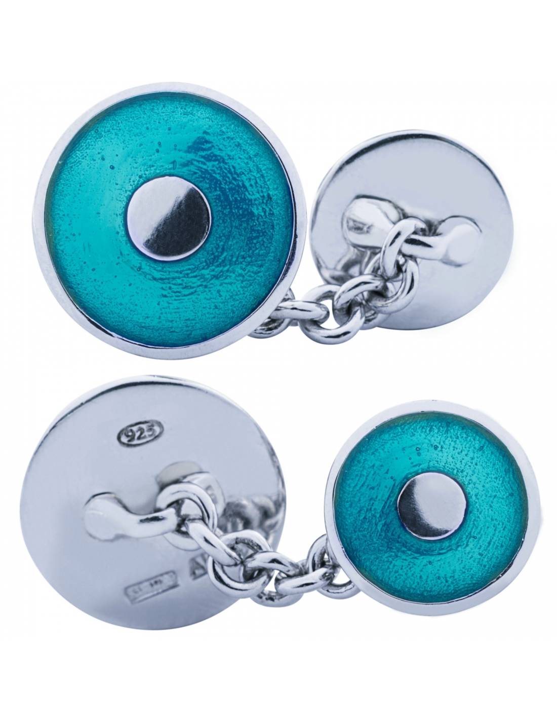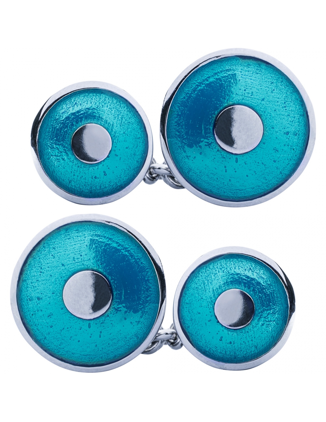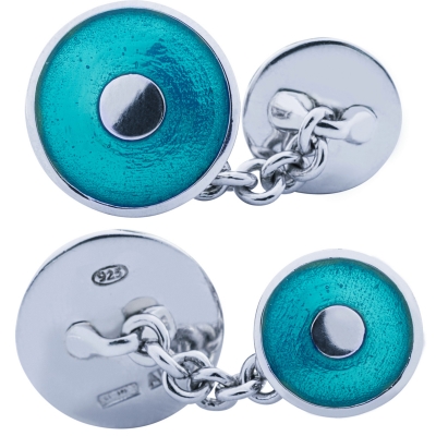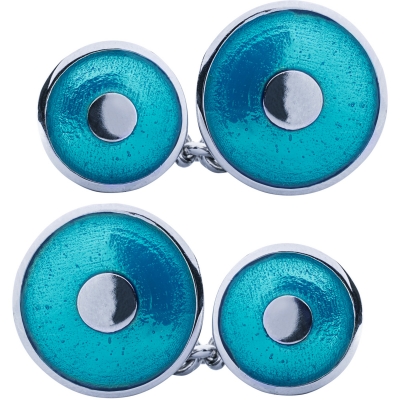Gemelli da polso in argento 925 rodiato a doppio elemento a cerchio bombato, smaltati a mano con smalto blu trasparente.